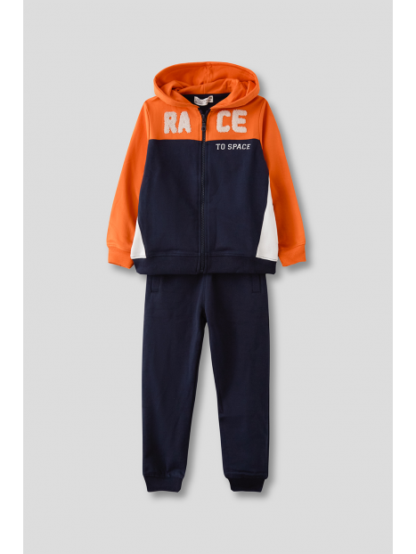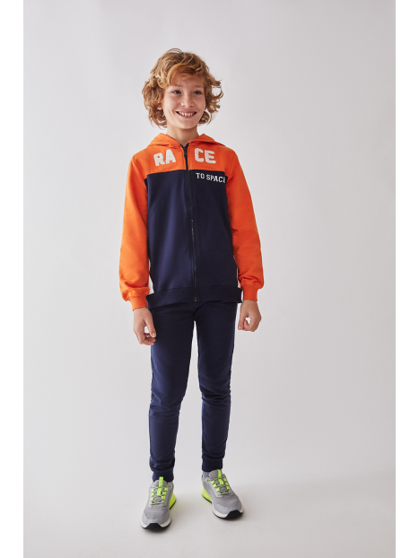 Conjunto sudadera con capucha naranja y marino, pantalón marino