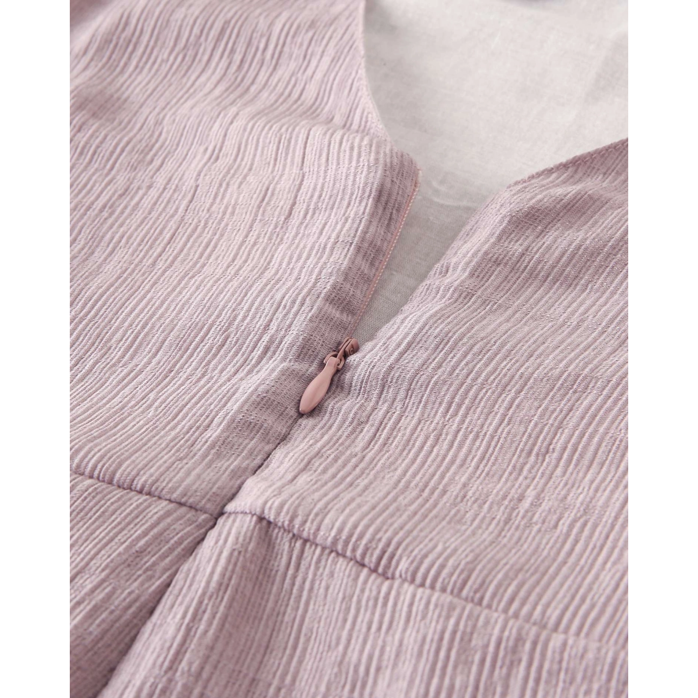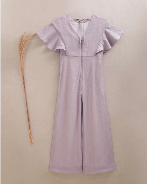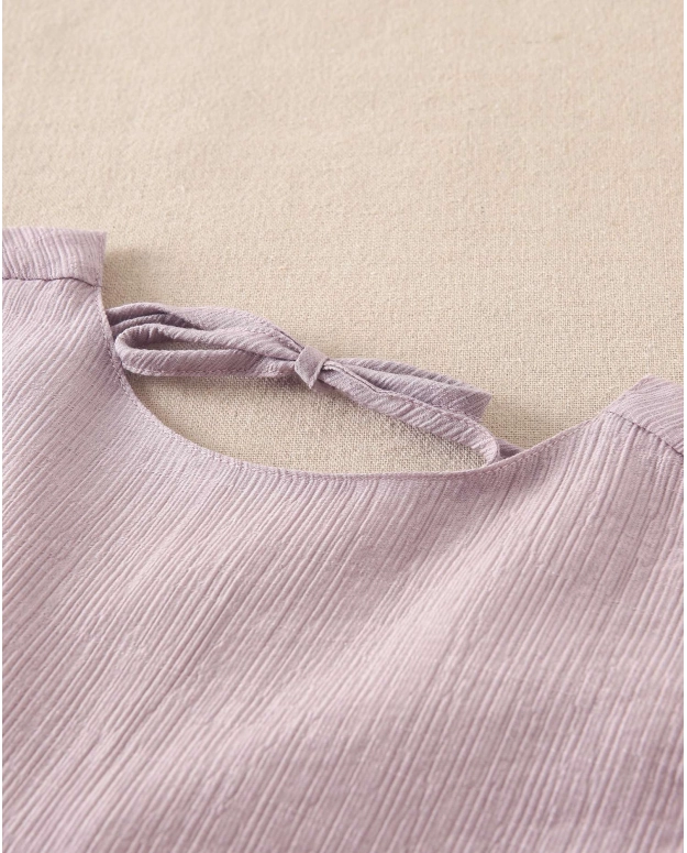 Mono largo de bambula malva para niña con drapeado delantero y escote trasero en V. Cierre con cordón fino, elegante y cómodo para ocasiones especiales.