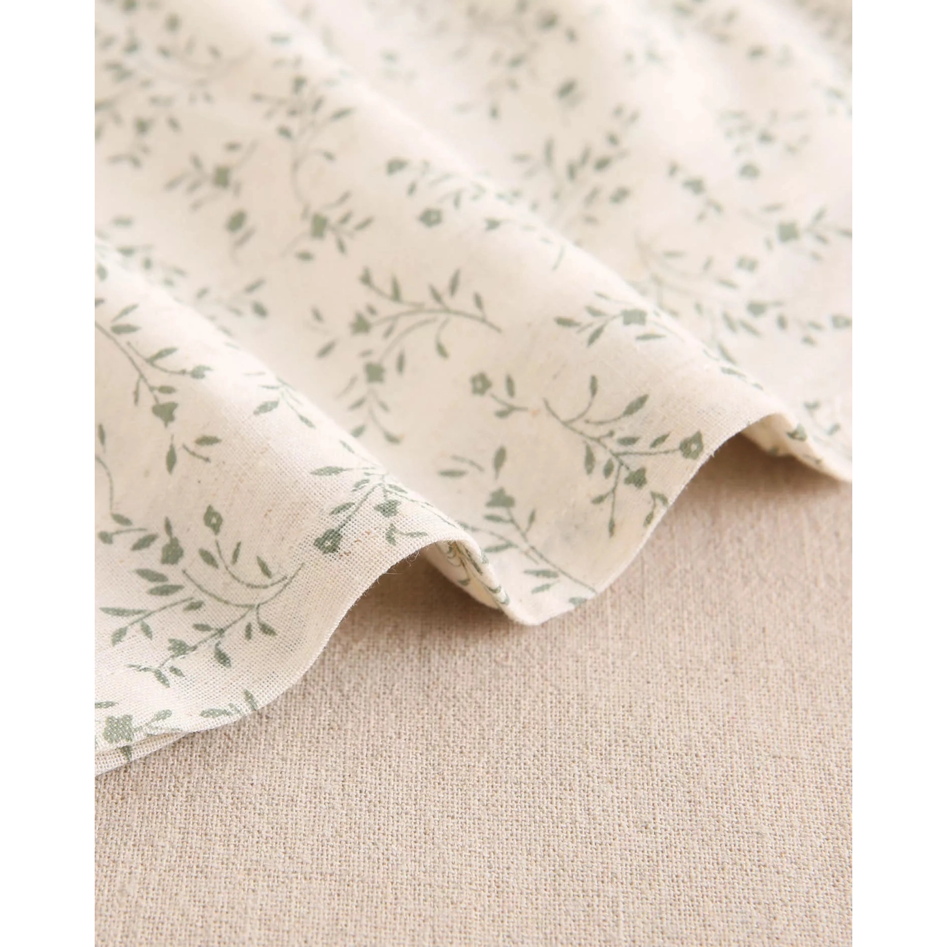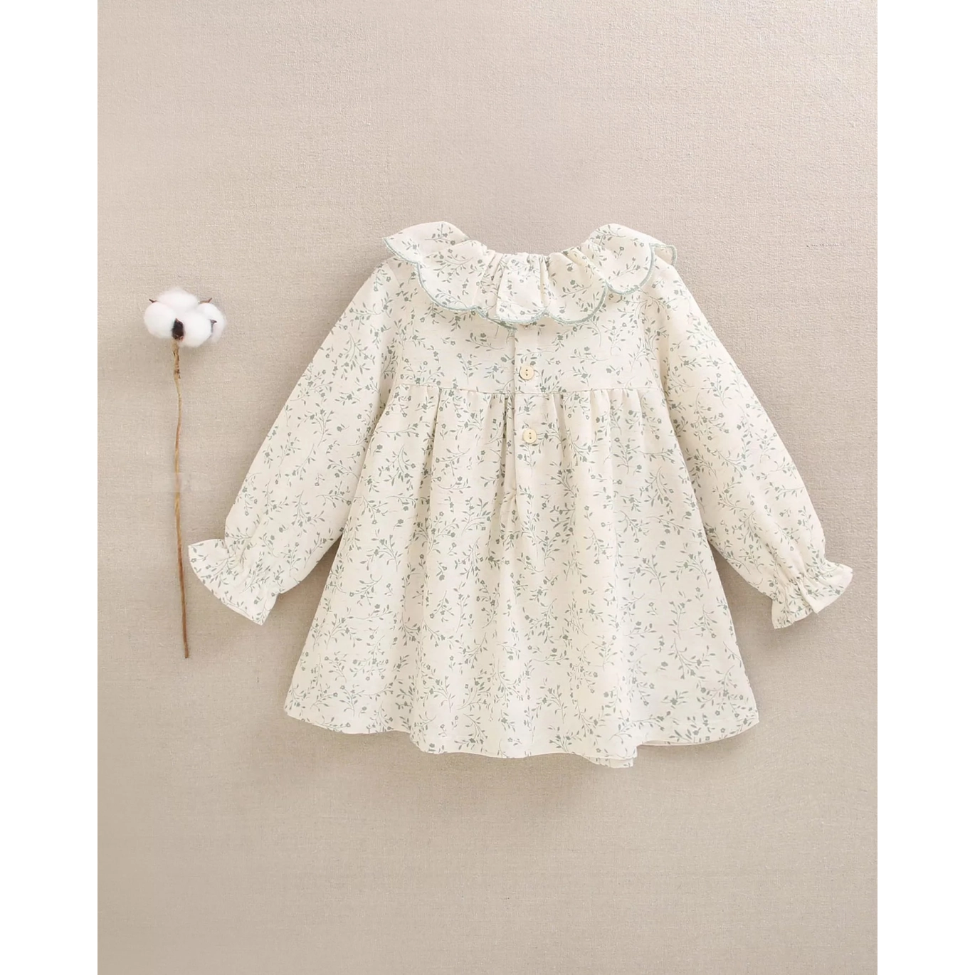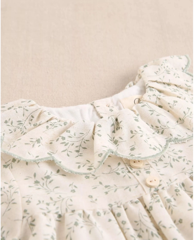 Vestido de bebé color crudo con estampado floral verde y volante en el cuello